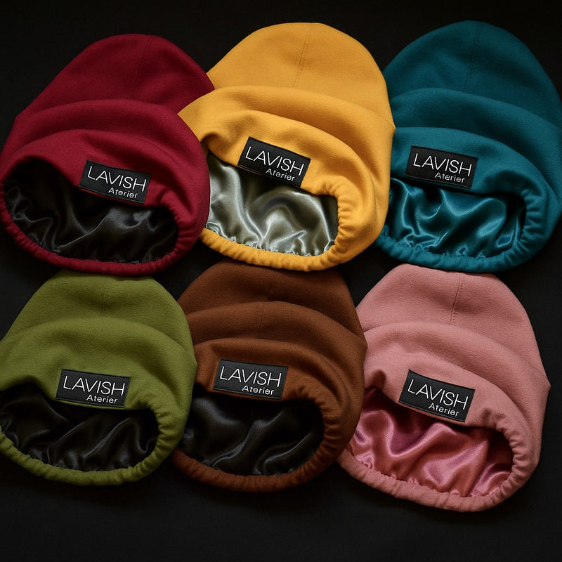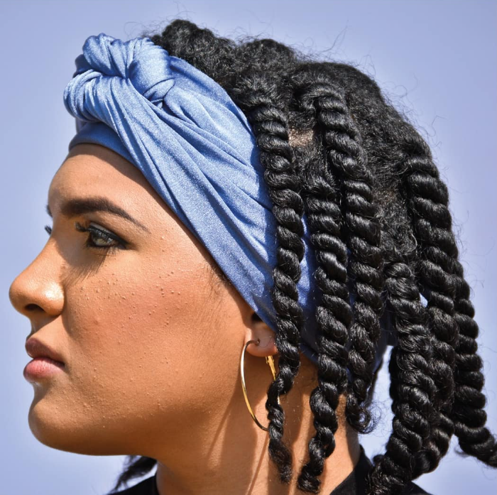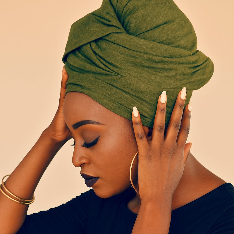 - Tie / secure: Cross those twisted parts behind your head and bring them forward to tie, or tuck them in so the wrap feels secure.